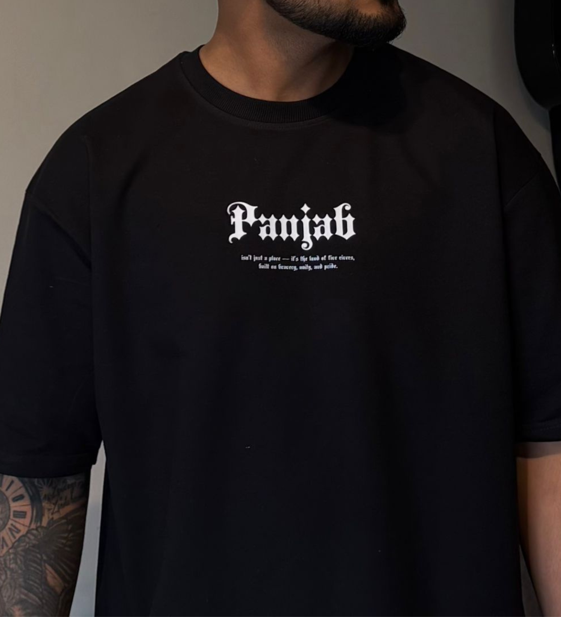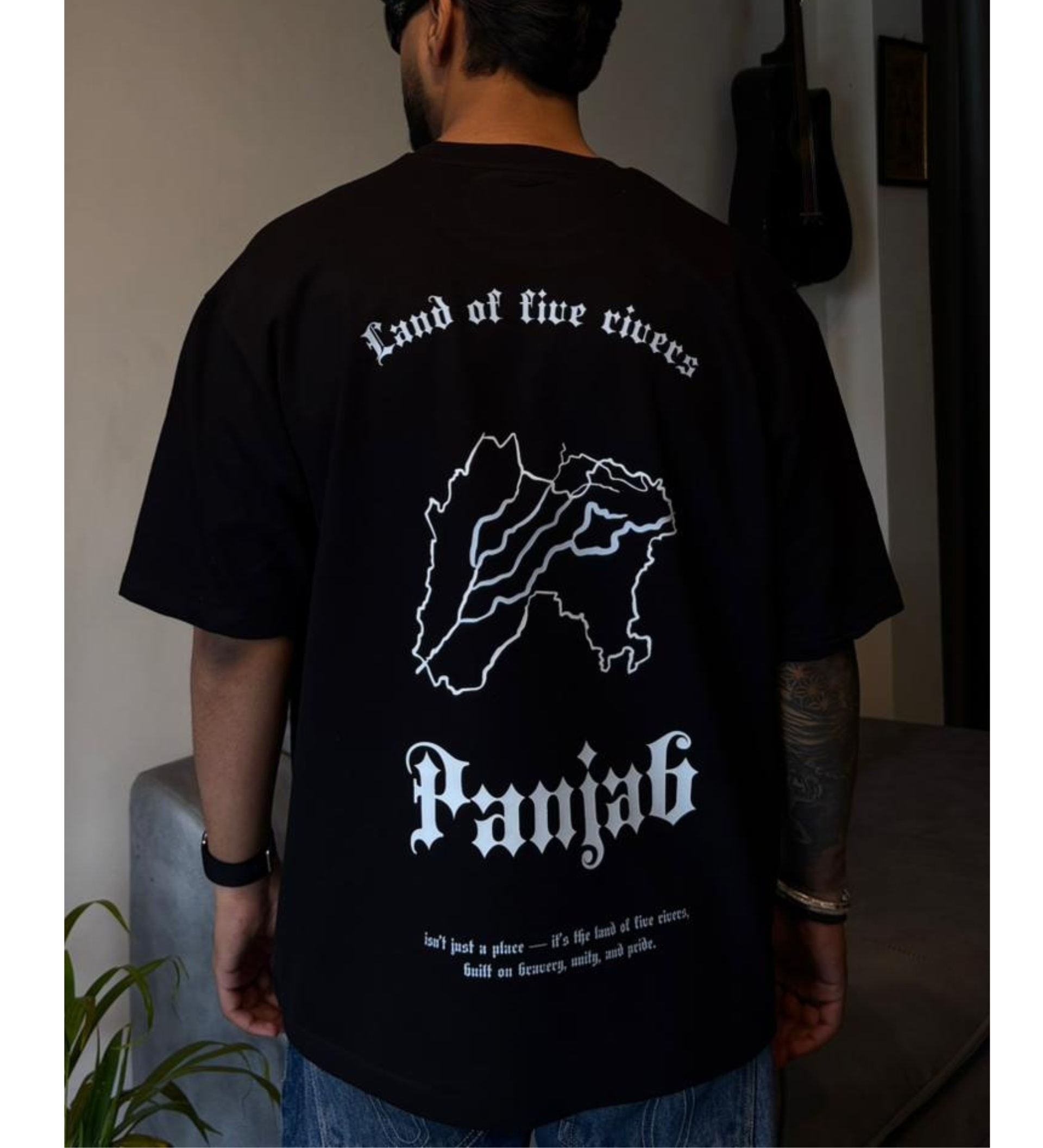 The back design features the iconic Panjab map outline with flowing river detailing, symbolizing the historic Land of Five Rivers. The gothic-style “Panjab” typography adds a powerful statement, making this more than just a t-shirt — it’s identity, heritage, and pride stitched into fabric.